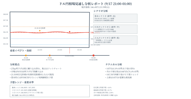 本セクションでは、今夜の相場を取り巻くマクロ要因と直近のチャート状況を整理します。主要材料は米国のFOMC(日本時間03:00発表)とその後のパウエル議長会見、そして本日21:30発表の米住宅指標です。FRBの利下げ観測は既に織り込まれているため、ドットチャートや会見内容で思惑が強まれば短期的なショートカバーやショート拡大が起きうる点に注意してください。日米金利差・日銀関連の報道や自民党総裁選のヘッドラインも相場心理を揺さぶるため、ニュースフローを逐次チェックすることが重要です。