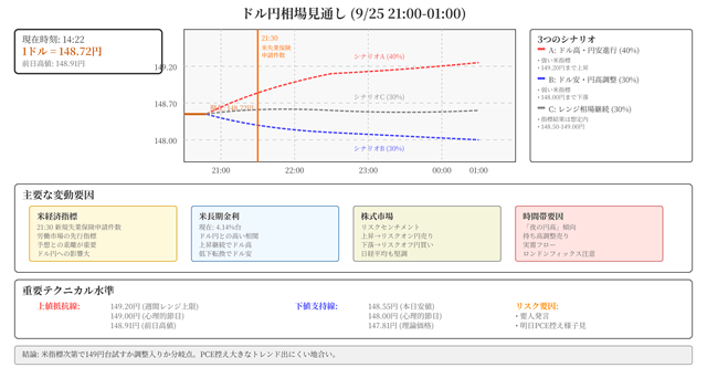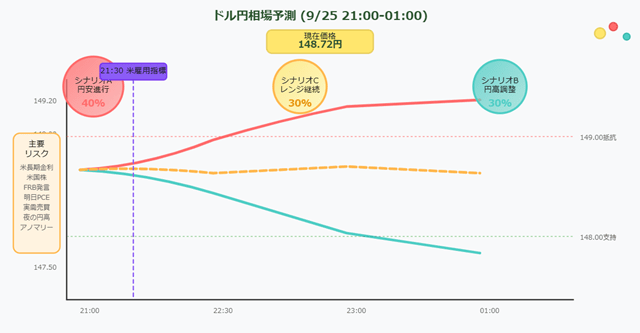最も体系的に時間帯別のレンジを提示。21:00〜22:00は148.60〜149.00、22:00〜23:00は148.50〜149.20、23:00〜01:00は148.65〜149.10と細かく予想。さらに「上昇シナリオの確率は40%、下落シナリオ30%、レンジ継続30%」と確率分布を示し、分岐点を整理。特に初心者向けに、取引前のポジション整理やストップ幅(20pips程度)、ロット縮小などの実践的リスク管理を強調。時間軸と確率を明示し、初心者にも対応策を具体的に示す分析です。