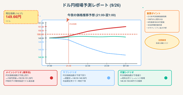 本記事は、ユーザー提供PDFに基づき複数AIレポートを統合して作成したナイトセッション(21:00–01:00 JST)の短期予想とトレード戦略です。米国の8月PCE(21:30発表)や米長期金利の動きが最大のトリガーで、これらの結果次第で短時間に50〜80銭程度の急変動が起きる可能性があります。短期トレンドは上方向のバイアスがある一方で、150円手前での利確売りや当局の介入警戒も残るため、ナイトセッションは「上振れ優勢のレンジ」を想定しつつ、指標後の値動きに柔軟に対応するのが現実的です。