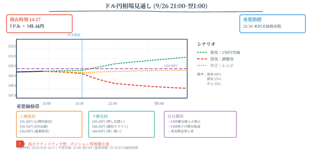 複数の時間軸での想定を詳細に示し、21:30のPCEと22:00以降のNY勢の参入がトレンド形成の主要因と位置づけています。短期のベースケースは149.20–149.80のレンジで、上方では150.00超え→150.50程度までの拡大を警戒。一方、下方では148.50〜149.00にかけてのサポート崩れが重要とする。取引方針としては、ブレイクは“確認してから追随”、押し目は小ロットで拾う、指標前後は新規建て控えを推奨しています。