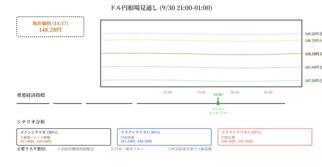 今夜(2025年9月30日 21:00–01:00)は、レンジ中心だが指標サプライズと月末フローで短時間の急変リスクが高いという構図が明確です。テクニカルでは200日移動平均(約148.40円)とピボットS1(147.94円)が分岐点になり、これらを下抜けると147円台前半までの下振れシナリオが現実味を帯びます。一方で指標が強ければ149円台トライの上振れもあり得ます。経験者は指標後の“方向確定時”に順張りで参加する戦術が有効ですが、初心者はノーポジあるいは極小ロットでの様子見が無難です。常にストップと資金管理を最優先に。最新の公的発表や要人発言に注視し、想定外の変化には柔軟に対応してください。