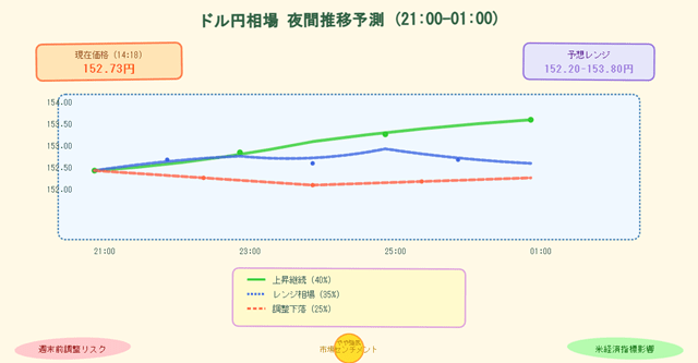 | 00:00–01:00 | 152.40–153.20 | 発表後の材料消化。薄くなるため突発的なスパイク注意。最終的に小幅レンジに収束する可能性高し。 |