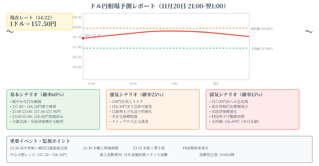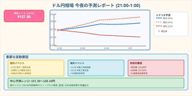 今夜のレンジは157.30〜158.10円が中心シナリオとなり、最も変動が起こりやすいのは23時前後と0時以降とされる。