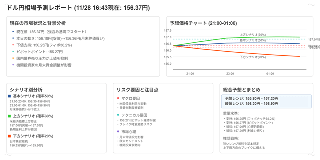 また、各AIは共通して156円台前半〜中盤でのレンジ推移をメインシナリオとして想定しており、強い材料がない限り157円を大きく突破する可能性は低いと判断しています。一方で、156.00円割れや157円接近時には流動性が薄くなる時間帯に絡んで、一時的に値が飛ぶリスクがあるため、慢心は禁物というスタンスです。